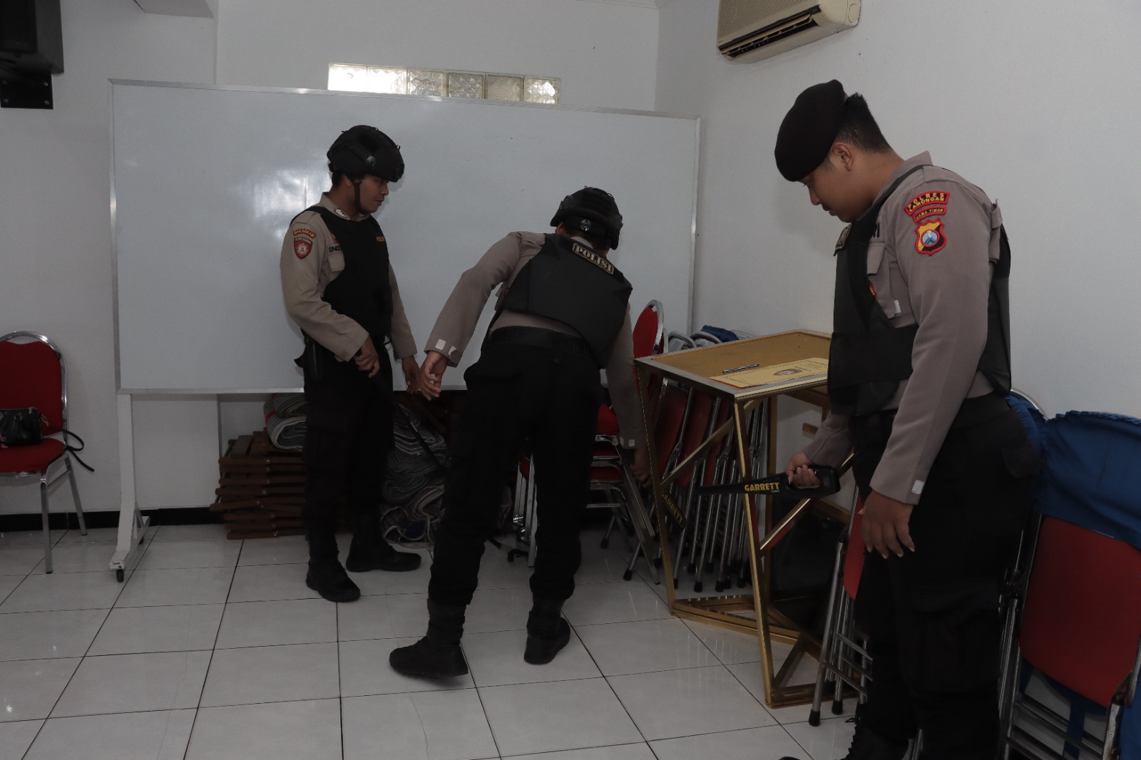 “Ada beberapa tahapan yang kami lakukan, mulai dari proses sterilisasi area gereja, pengecekan ruangan dan lingkungan luar, pemeriksaan barang bawaan jemaat, hingga penjagaan di area luar gereja.” jelasnya.